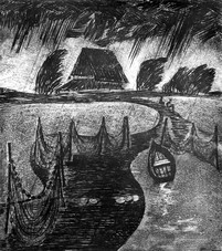 Plămădeală - Ploaie în delta, 1981, acvaforte, 42x45